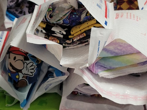 Padded Envelopes are full of MYSTERY fabric scraps. They contain scraps, half yards, end of rolls, and even a whole yard of fabric. The designs are random and you can find designs from the first year to even designs that have not come out yet.